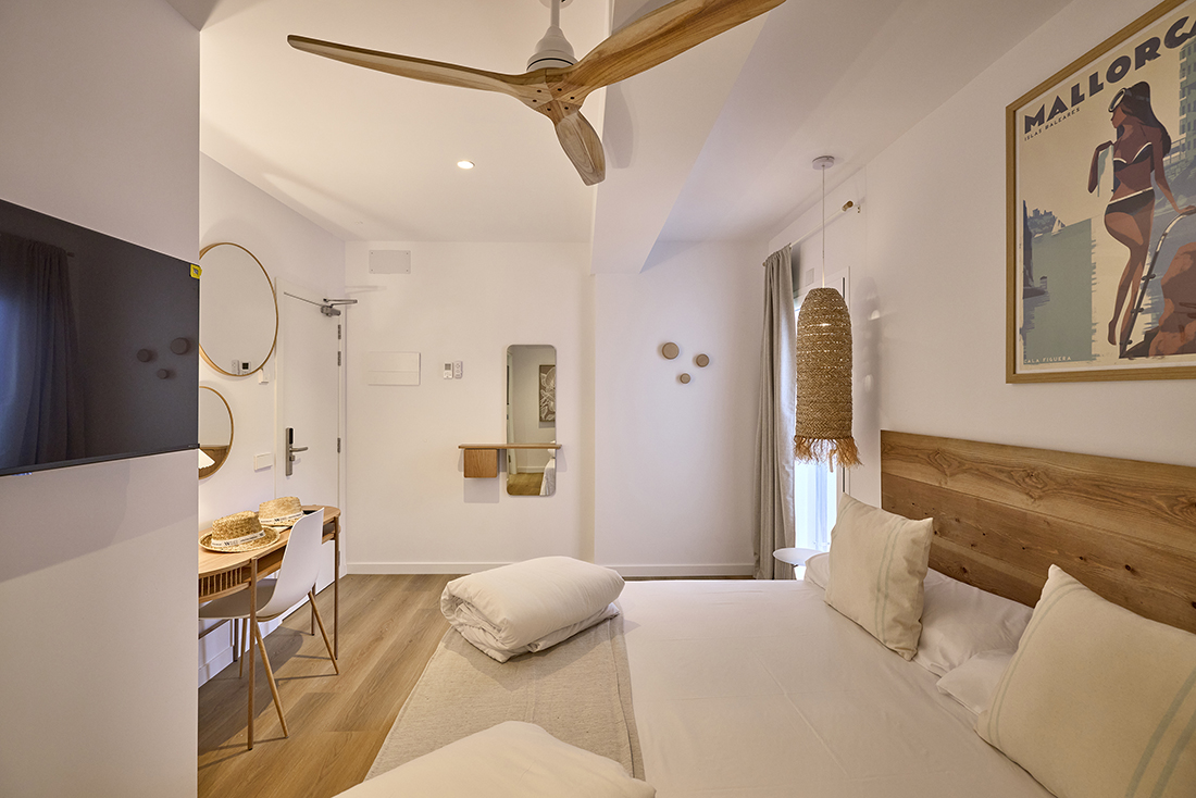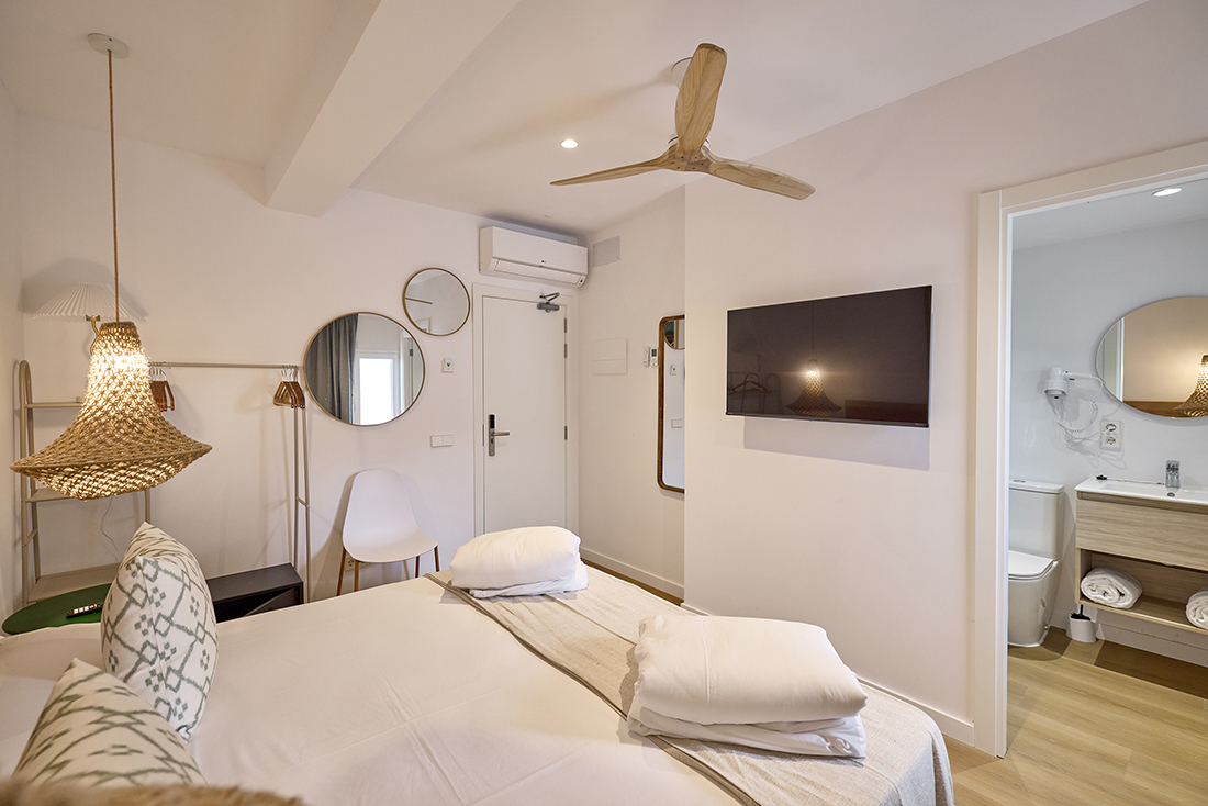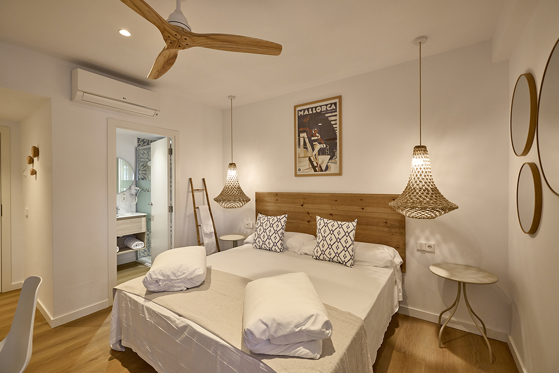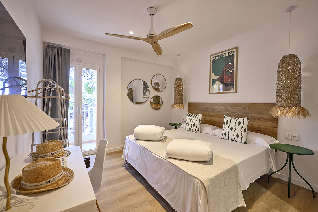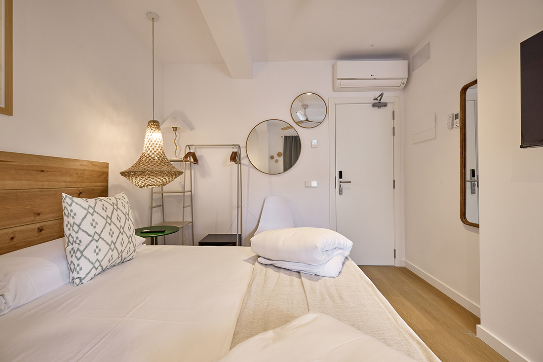Habitaciones pensadas para tu descanso En INNER Hostal Es Molí cuidamos cada detalle para que te sientas cómodo desde el primer momento. Nuestras habitaciones están diseñadas con un estilo funcional y mediterráneo, luminosas, frescas y equipadas con todo lo que necesitas: aire acondicionado, baño privado, Wi-Fi gratuito y servicio diario de limpieza. Algunas de nuestras habitaciones cuentan con balcón o terraza, perfectos para disfrutar del aire libre y los cálidos atardeceres mallorquines.